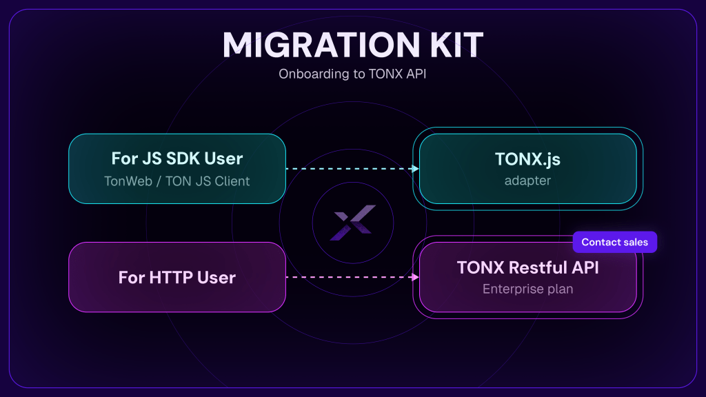 TONX API provides seamless migration adapter with enhanced features for your Telegram Mini Apps and Web3 applications. Our platform ensures 99.99% uptime with instant scaling capabilities. Just a few code changes and you’re ready to go.